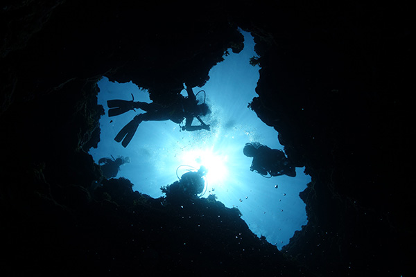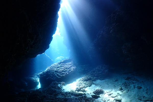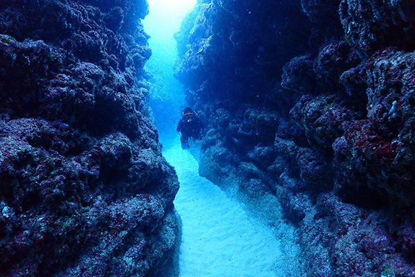 砂地と隆起珊瑚の地形を一番体感できるポイント、真っ暗な洞窟に入り、リュウキュウハタンポに囲まれながら出口に射し込む光を求めて進むのは、まさに冒険! クシハダミドリイシサンゴでは、ホンソメワケベラのクリーニングステーションになっており、水面に近い事からダツがクリーニングされてる様は圧巻、サンゴ合間から光のシャワーを浴びる時間はダイバーならではの至福の時間。