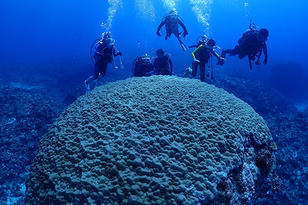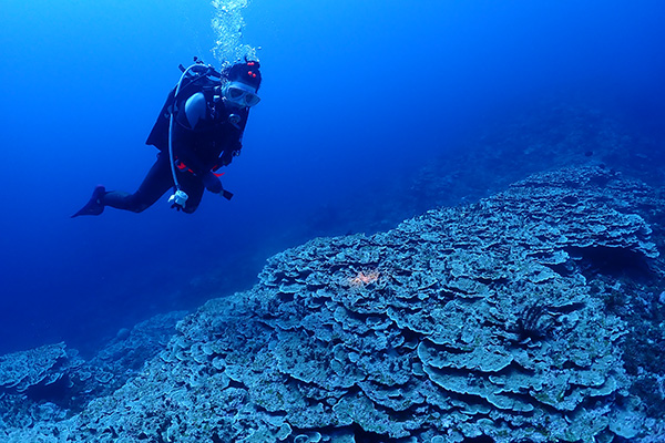 碧く広がる珊瑚、離れ根にはミズタマ珊瑚のバブルコーラルシュリンプやオランウータンクラブなどの甲殻類、30m付近にはスミレナガハナダイのコロニーや、10m以浅の棚にはモンツキカエルウオのコロニーだったりと浅場も深場も様々な魅力たっぷりのポイント! 初夏には、ハナゴイやキホシ・オキナワスズメダイなどの幼魚が群れ新しい命の誕生に沸く! 当店も参加している知名町サンゴ保全対策協議会の珊瑚の植え付けポイントがここで、復活を目指す珊瑚にも注目したい。