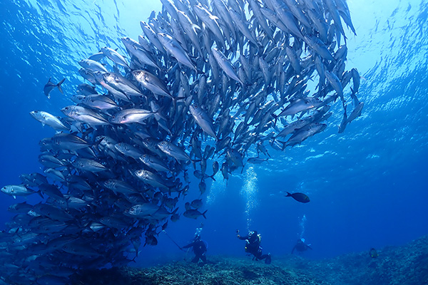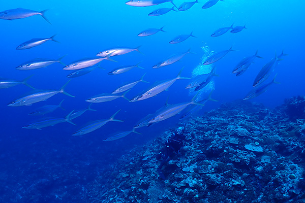 沖永良部島が誇る、ギンガメアジのポイント!!!冬場から群れが大きくなり始め、3,4月にはトルネードを形成する。最近は夏場でも数百匹程度の群れは確認出来てる、ギンガメ最盛期は、ロウニンアジやイソマグロも見れ、過去にはギンガメトルネードにザトウクジラの子供が突っ込むという衝撃的なシーンも目撃!何度潜ってもワクワクが止まらないポイント。