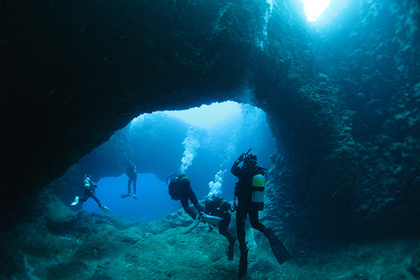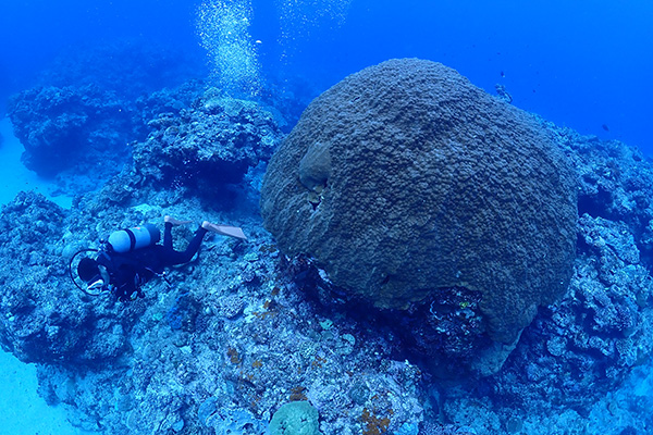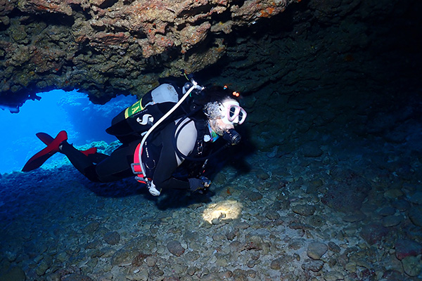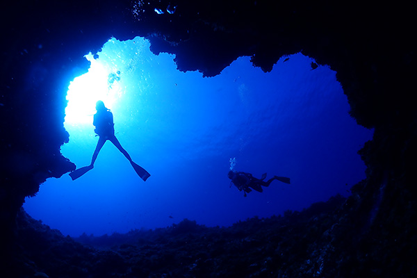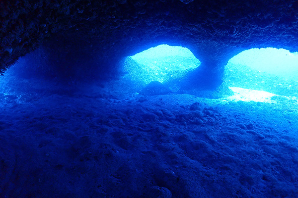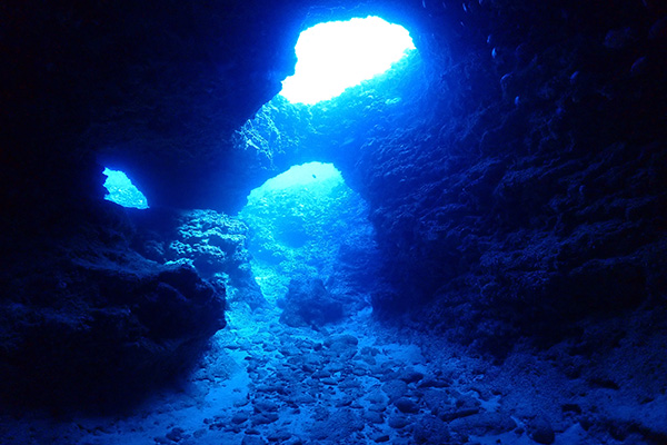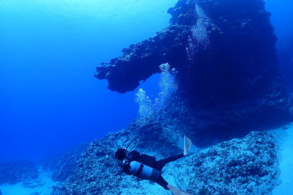 30mオーバーに多方向に伸びる洞窟内はネムリブカが寝ていたり、リュウキュウハタンポが群れをなしていたり、ハート型のアーチだったりと深い場に魅力が多く上級者向けのポイント、棚の上は巨大なウミキノコが亀の寝床になりモンツキカエルウオなども見れ、浅場のコース取りをすれば初心者からも可能、水深で大きく表情が変わる所も面白い。