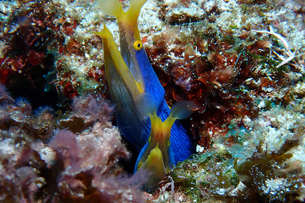 東シナ海と太平洋を分断する田皆岬(国立公園)の真下で海域も国立公園に含まれる珍しいポイント。水中にも大きな根が張り出し、そこにあたるプランクトンを求めて魚が集まる魚影の濃いポイントとなっています。初夏には沖永良部島では目撃例の少ないマンタが出現する事も! 根沿いのイソバナにはクダゴンベやヒオドシベラ幼魚などのマクロも見逃せない。ハナヒゲウツボの撮影している頭上をイソマグロが通過するなんてことも多い。キョロキョロは欠かせません♪