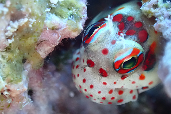 隆起珊瑚の魅力を特に感じられるポイント! 水深30m付近まで珊瑚が育ち、クレパスや洞窟、珊瑚にガレ場などゆっくりフィッシュウオッチングを楽しみたい。主なルートとしては10m弱の棚と20m付近の珊瑚や洞窟、スポットライト的に光が射し込む洞窟では、光のシャワーを全身に浴びてもらいたい! クレパスの間は、共生ハゼの宝庫でハタタテシノビハゼ、硬骨海綿などちょっとレアな被写体なども多数。