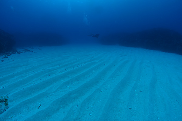 10mの砂地と28mの砂地の2段になった地形、深場では、ヨスジフエダイ(地域名:ピタロー)がトルネードする、ピタロートルネードが名物、島の西側最大の砂地は、夏の陽射しを浴びて砂地に映る影を見ながらのダイビングは、太陽と透明度が織りなす絶景!空を飛ぶように楽しんでもらいたい。