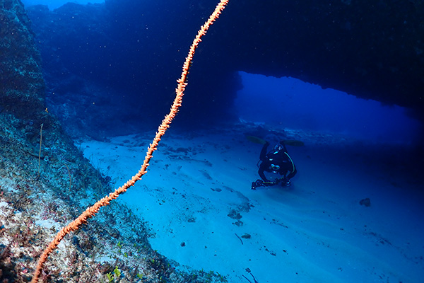 L字方のアーチと、3つの穴が見える独特のアーチや、洞窟内に群れるアカマツカサ、ベニマツカサ、浅場ではモンツキカエルウオ、ヒバシヨウジなどもマクロの被写体も多い、地形とマクロが楽しめる隆起珊瑚の島、沖永良部島らしいポイントの一つ。
